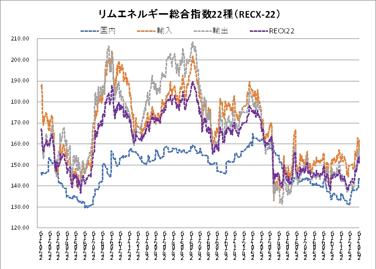 3日のリムエネルギー総合指数22種(レックス22)は152.71と、前日比2.13ポイント反落した。内訳は、国内(9種)が前日比同水準の143.77、輸入(9種)が同2.87ポイント安の160.45、輸出(4種)は同3.51ポイント安の153.92だった。 輸入指数は下落した。石油製品、ベンゼン、プロパン、ブタンなどが軒並み軟化した。原油安を受けた。 輸出指数も切り下がった。ジェットケロシン、軽油、380cst重油など各製品が剥落した。シンガポール先物価格の落ち込みを反映した格好。