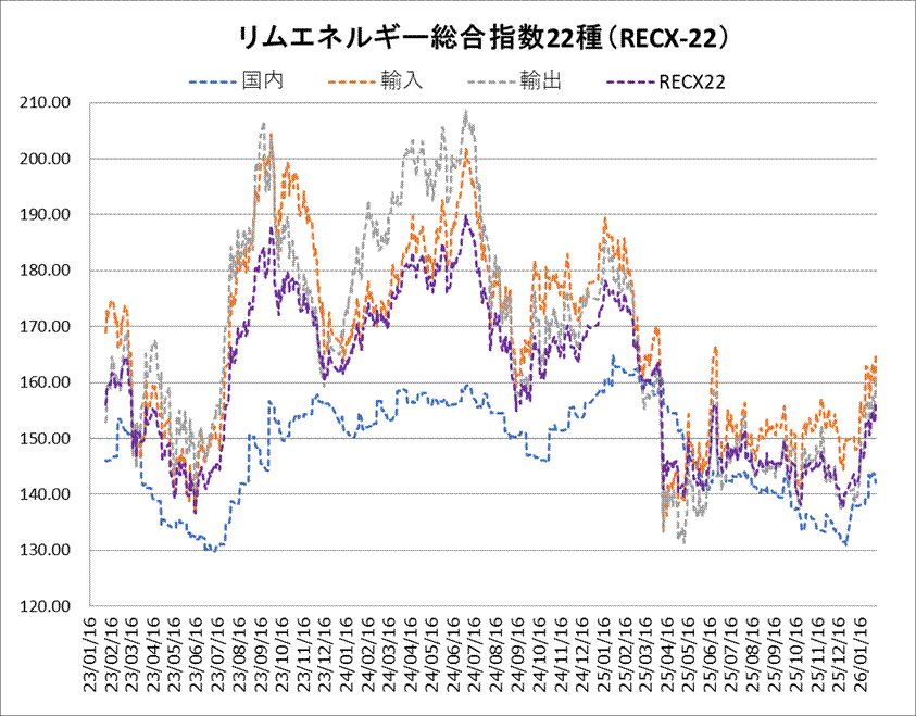 6日のリムエネルギー総合指数22種(レックス22)は155.94と、前日比1.20ポイント上昇した。国内(9種)が142.00と前日から0.24ポイント下落したものの、輸入(9種)が164.63と同2.28ポイント、輸出(4種)が161.19と同1.57ポイントいずれも上昇し、総合指数の上げに寄与した。