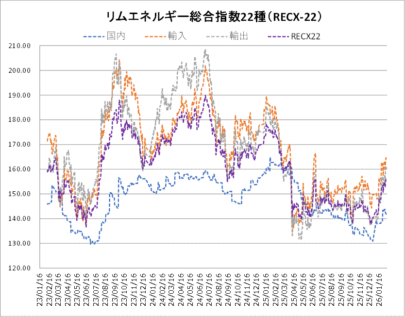 9日のリムエネルギー総合指数22種(レックス22)は155.52と、先週末比0.42ポイント反落した。国内(9種)が141.81と先週末から0.19ポイント、輸入(9種)が164.24と同0.39ポイント、輸出(4種)が160.50と同0.69ポイントいずれも下落した。