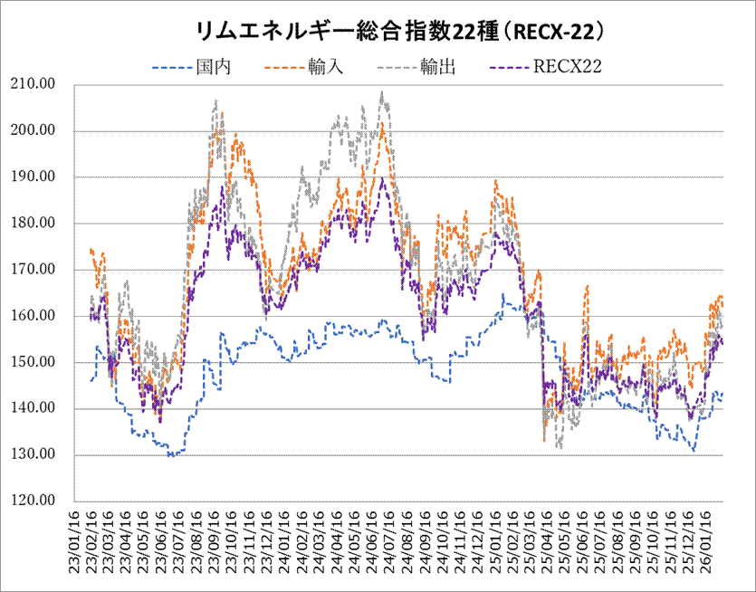 13日のリムエネルギー総合指数22種(レックス22)は反落。前日比1.27ポイント安の153.99となった。とりわけ国際原油市況の軟調を受け、輸出入指数の下げが目立った。国内(9種)は143.24(前日比0.06下落)、輸入(9種)は161.72(同2.64下落)、輸出(4種)は157.01(同1.11下落)。 国内指数では、ガソリンが前日から0.55~1.18ポイント下振れし、全体の下げを主導した。その他の油種は横ばいだった。 輸入指数では、LNGが前日から11.33ポイント安と最大の下げを記録。プロパンとブタンが3.14~3.18ポイント安で続いた。反面、高硫黄重油は1.47ポイント上昇し、独歩高となった。 輸出指数では、ベンゼンが前日から2.00ポイント下押した。ジェット燃料油と軽油も1.34~1.37ポイント軟化した。輸入指数と同様、高硫黄重油が1.79ポイント上振れし、輸出全体の下げを抑えた。