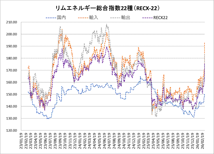 3日のリムエネルギー総合指数22種(レックス22)は175.74と前日比15.21ポイント急伸した。国内(9種)は150.10(前日比2.00ポイント上昇)、輸入(9種)は193.56(同22.83ポイント上昇)、輸出(4種)は183.56(同20.77ポイント上昇)。 国内指数は、ガソリンが京浜渡しで前日比10.47ポイント、阪神渡しで同10.45ポイントといずれも大幅上伸。中東情勢緊迫化による石油元売りの在庫への懸念から、売買水準が跳ね上がった。輸出入指数も総じて急伸した。原油高に加え、各製品の供給不安が相場を押し上げた。輸入指数は、ジェット燃料が同31.15ポイント、プロパンが同26.99ポイントとともに大幅高。輸出指数もジェット燃料が同34.34ポイント、軽油が同28.90ポイントとそれぞれ急伸した。