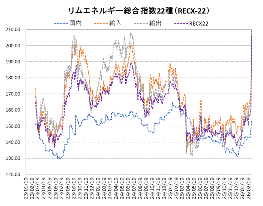 リムエネルギー総合指数22種(レックス22)は5日、前日比20.28ポイント高の206.64と節目の200を突破した。211.72をつけた2022年7月6日以来、約3年8カ月ぶりの高水準。総合指数を構成する3指数のうち輸入(9種)が31.71ポイント高の242.36と上昇を牽引し、輸出(4種)も224.13で27.39ポイント高と上げ幅を広げた。一方、国内(9種)は153.43と1.72ポイントの上昇にとどまった。