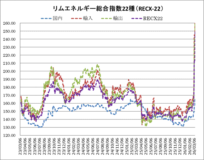 10日のリムエネルギー総合指数22種(レックス22)は251.23と先週末から38.04ポイント上昇した。内訳は国内(9種)が同7.98ポイント上昇の166.57、輸入(9種)が同53.76ポイント上昇の296.38、輸出(4種)が同52.37ポイント上昇の290.74となっている。