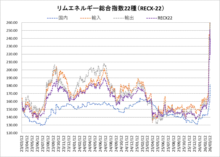 13日のリムエネルギー総合指数22種(レックス22)は238.94と、前日比10.45ポイント大幅に続伸した。国内(9種)は181.24(前日から横ばい)、輸入(9種)は272.33(同16.96ポイント上昇)、輸出(4種)は263.26(同14.41ポイント上昇)となった。