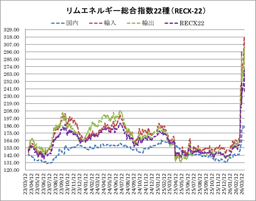 26日のリムエネルギー総合指数22種(レックス22)は、237.16と前日から14.90ポイント下落し、全面安となった。内訳は、国内(9種)が同2.35ポイント安の183.62、輸入(9種)が同22.52ポイント安の270.32、輸出(4種)が同19.83ポイント安の257.53となった。 国内指数は、ガソリンの急落を映した。前日比36.43ポイント安と全体を押し下げた。小売価格の高騰で需要は後退。原油市況の急落や政府が補助金支給を26日から拡大。先安見通しが強まったことを映した。一方、全般的にマーケットで様子見気運が強く、ガソリン以外の製品は前日からもち合った。 輸入指数は全面安。原油市況の急落を映した。このうち、ジェットは前日比77.13ポイント安と全体を押し下げた。中東情勢の緊張による急騰に対して、ここに来て域外品の流入が増加。需給逼迫が急速に後退した。 輸出指数も全面安。輸入指数同様にジェットは前日比85.36ポイント安と全体を押し下げた。また、380cst重油も同16.22ポイント安となり、3月中旬までの歴史的な暴騰に対するバンカー需要の急減も反映された。