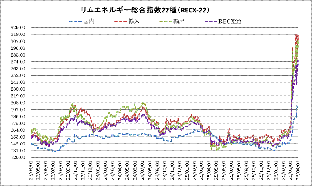 1日のリムエネルギー総合指数22種(レックス22)は、269.81と前日から5.58ポイント低下した。内訳は国内(9種)が200.98と前日比0.3ポイントの上昇。一方、輸入(9種)は309.89と前日比6.69ポイント、輸出(4種)も298.56と同10.34ポイント下回った。 国内指数はガソリンや軽油が様子見を強めるなか、プロパンやブタンが上昇。中東情勢の緊張に伴う4月渡しの供給不 安を映した。 一方、輸出入指数は下振れ。アジア時間の原油軟化が響いた。ジェット燃料や軽油、ベンゼンやプロパンなどで値位置が見直されている。