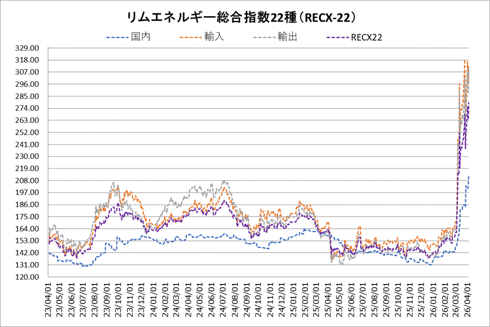 3日のリムエネルギー総合指数22種(レックス22)は急反発。前日比15.39ポイント高の278.90となった。とりわけ輸出入指数の上げが目立った。米トランプ大統領が東京時間2日午前に行った国民向け演説で、イラン戦争終結への具体的な道筋が示されず、国際原油市況が高騰したことを受けた。国内(9種)は212.07(前日比6.40上昇)、輸入(9種)は311.86(同15.43上昇)、輸出(4種)は312.78(同24.33上昇)。 国内指数では、A重油とLSA重油が前日から18.70~18.89ポイント下落。灯油も9.17~9.22ポイント下押した。しかし、プロパンとブタンが19.08~20.32ポイント急伸し、石油製品の下げを相殺した。その他の油種は横ばいだった。 輸入指数は全面高。軽油が前日から80.05ポイント暴騰したほか、高硫黄重油の21.29ポイント高が続いた。低硫黄重油も17.05ポイント上振れた。 輸出指数も軒並み高となった。軽油が前日から87.46ポイント跳ね上がり、全体の上げを主導。高硫黄重油も21.89ポイント大幅上昇した。