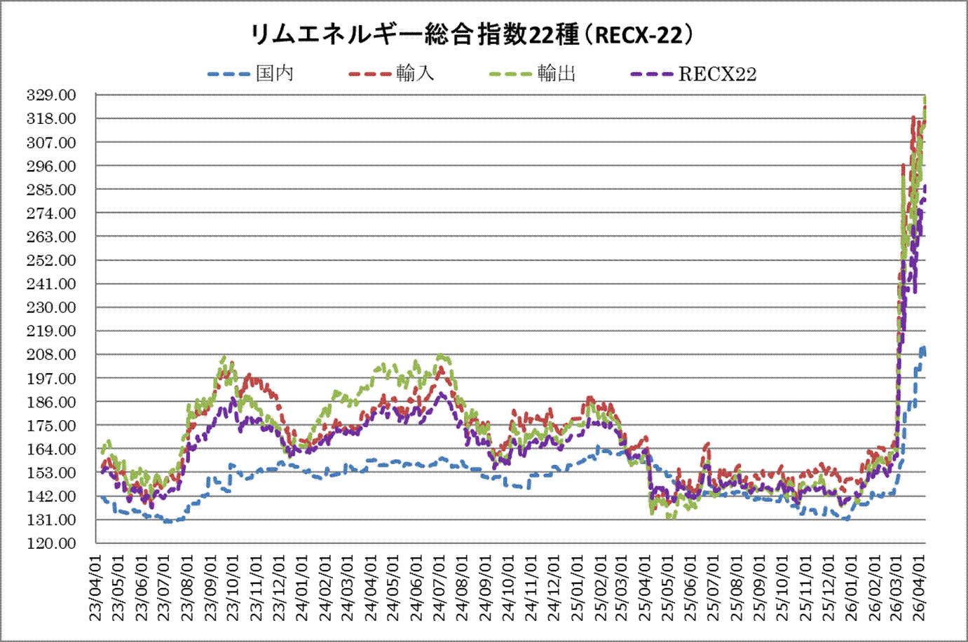 7日のリムエネルギー総合指数22種(レックス22)は、前日比6.54ポイント高の286.29となった。内訳は国内(9種)が207.92と前日から0.15ポイント続落した一方、輸入(9種)は323.27と同6.55ポイント続伸。輸出(4種)は327.68と同13.20ポイント反発した。