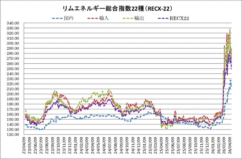 16日のリムエネルギー総合指数22種(レックス22)は、前日比6.94ポイント安の249.32と続落した。内訳は国内(9種)が216.21と前日比1.01ポイント高、輸入(9種)が267.92と同11.67ポイント安、輸出(4種)が263.83と同10.18ポイント安。