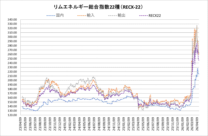 20日のリムエネルギー総合指数22種(レックス22)は、前週比0.19ポイント低下し246.56となった。内訳は国内(9種)が214.68と前日比0.30ポイント安となった一方、輸入(9種)は261.05と同0.79ポイント高。これに対し、輸出(4種)は263.94と同1.08ポイント下落した。