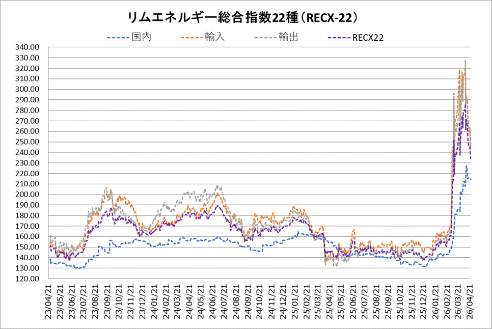リムエネルギー総合指数22種(レックス22)は22日、前日比6.32ポイント低下し234.14(2010年平均=100.00)と240を割り込んだ。228.49をつけた3月12日以来の低水準。総合指数を構成する3指数のうち輸入(9種)が9.70ポイント低下の243.37、輸出(4種)が244.38で9.24ポイント低下した。一方、国内(9種)は214.68と2日連続の横ばい。