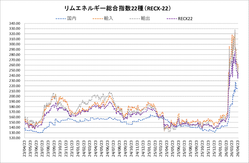 24日のリムエネルギー総合指数22種(レックス22)は、前日比2.60ポイント上昇の243.82と続伸した。内訳は国内(9種)が前日から横ばいの214.27、輸入(9種)が同5.42ポイント上昇の260.84、輸出(4種)は同2.40ポイント上昇の256.36だった。