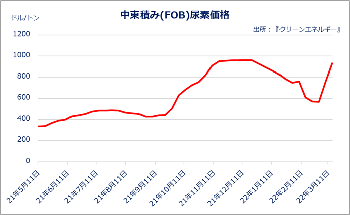 ロシアによるウクライナ侵攻で尿素の原料となる天然ガス、石炭価格が高騰。採算の悪化で欧州の主要メーカーが尿素の生産量を減らす方針を示すなど供給不安が広がった。また、最大輸出国ロシアが制裁に対する報復措置として輸出を一時的に止めたと市場に伝わると、需給逼迫懸念が急速に高まった。