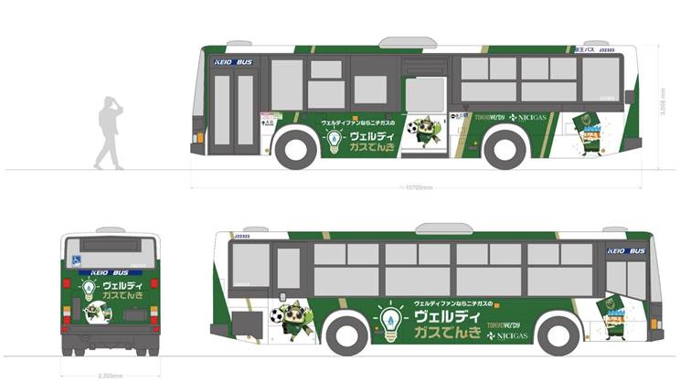 ガス事業大手のニチガス(本社=東京都渋谷区)は5月1日から東京都稲城市や多摩市で、同社が支援するプロサッカークラブの東京ヴェルディ(東京V)と協力し、両社のマスコットをあしらったラッピングバスを運行している。バスは京王バス多摩営業所管轄の路線を走り、ニチガスのガス・電気を使用すると売り上げの一部が東京Vの補強費に充てられる「ヴェルディガスでんき」を宣伝する。