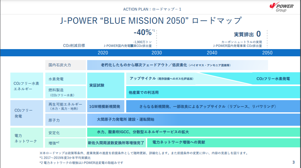 JPOWERは2月26日、カーボンニュートラルと水素社会の実現に向けた取組みとして"BLUE MISSION 2050"を公表した。2050年に向けて、発電事業のカーボンニュートラルを実現すべく、段階的取り組みとして2030年の二酸化炭素排出量を40%削減(2017~2019年の平均実績比)、2050年には実質排出をゼロとする。