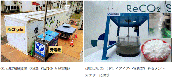 東洋建設とエア・ウォーターは7月、エア・ウォーターが開発した小型装置を使用し工事現場や作業船から排出される二酸化炭素(CO2)の回収と利活用を想定した実証実験を共同で実施した。実証では、ディーゼル発電機から排出されたCO2を回収して高純度の液化炭酸ガスとドライアイスを製造。さらにドライアイスをセメントスラリー(セメントと水の混合液)に混入することでCO2の固定化に成功した。 東洋建設は、2024年度をめどに海上工事の作業船への回収装置搭載を検討している。将来的には保有する作業船から発生するCO2を回収し、作業船上でセメントや地中へのCO2固定量を最大化する技術の開発にも取り組む予定。 両社は今回、北海道にあるエア・ウォーターのグループ企業の工場で小型CO2回収装置「ReCO2 STATION」を使用して実証を実施。同装置は排出ガスに含まれる低濃度のCO2を高効率に回収し、液化炭酸ガスやドライアイスを製造することができる。実証では、海上工事での運用を想定した条件で、ディーゼル発電機(作業船電源用)から排出されるCO2の回収量と電力消費量を検証。加えて、回収したCO2から製造した液化炭酸ガスとドライアイスの品質の確認なども実施した。