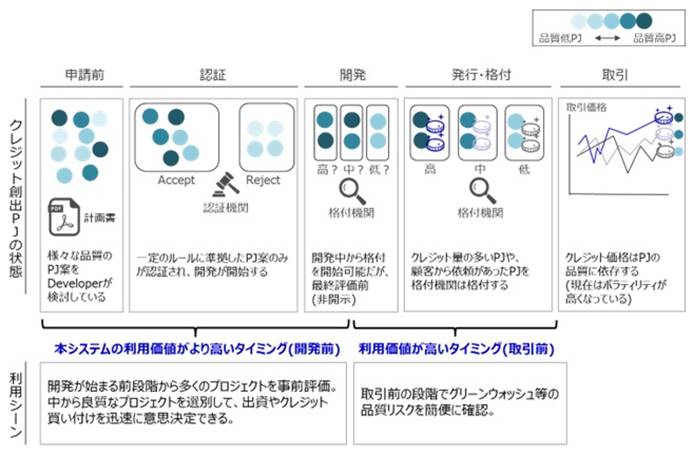 (炭素クレジットとシステムの利用、イメージ) 図の出所: 大阪ガス 発表資料(4日) 注) PJ=プロジェクト、 ボラティリティ=価格変動の度合い