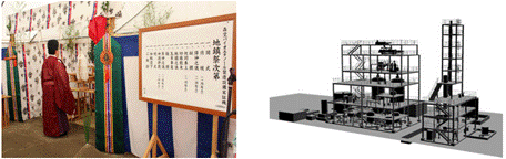 実証プラントの地鎮祭の様子(左)、実証プラントのイメージ(右)