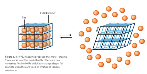 「金属有機構造体(metal-organic frameworks:MOF)」とは、金属イオンでつながれた分子と分子の間に、部屋のような隙間を複数持つ多孔室材料で、そこに意図した分子を出入りさせることができる。さらに、内部に広大な表面積を得る特長があり、数グラムでサッカー場1面に匹敵する広さを持つMOFもあるという。3者の共同研究ではなく、それぞれに研究が進められた。まず、ロブソン氏が銅イオンと4本の「腕」(原子価)を持つ分子を結合させ、MOFの基礎となる分子モデルを1989年に発表した。この分子モデルは不安定で壊れやすかったが、その後、1992年から2003年にかけて、北川氏とヤギー氏が安定した構造のMOF製造方法を確立していく。1997年には北川氏が、メタンや窒素、酸素といったガスの吸収や放出が可能な、呼吸しているかのように柔軟なMOFを発表し、社会実装への可能性を示した。ヤギー氏はMOFの耐熱性や安定性に優れたMOFの成果を出した。