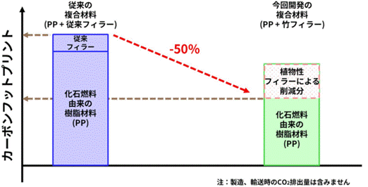 同社によれば、竹は一般的な木材の4倍以上のCO2を吸収しつつ、急速に成長するため費用対効果が高い素材で、国内では放置竹林の問題もあり、竹を活用した複合材料の開発は、社会的課題解決に繋がるとしている。今回開発された複合材料は、竹が吸収したCO2を「缶詰」のように内部に保持できる特性がある。天然繊維に起こりがちな吸湿性と接着性の課題にも、天然由来の添加剤の選定や樹脂と竹の最適な接合にも成功。臭気や難燃性などの基準もクリアしたため、厳しい基準が必要となる自動車部品にも採用が可能として、添加剤を従来のタルク(滑石)から竹複合材料への置き換えを提案していく方針だ。