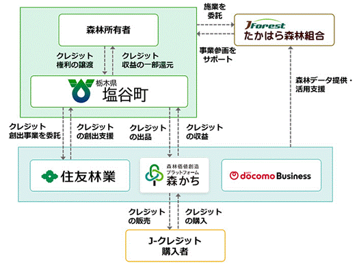 役割分担としては、塩谷町がクレジットの創出、販売と私有林保有者への収益還元を担当、たかはら森林組合は森林経営計画に基づき、伐採、再造林、保育を実施する。住友林業とNTTドコモビジネスは、森林価値創造プラットフォーム「森かち」を通じて、Jクレジットの創出と販売を担う。2027年には、Jクレジット認証と販売を始める予定だ。