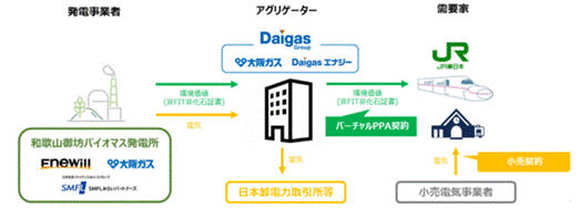 この契約では、エネウィル、大阪ガス、SMFLみらいパートナーズがFIT(固定価格買取制度)で運営してきた和歌山御坊バイオマス発電所を、FIP(フィードインプレミアム)制度へと移行し、同発電所が発電する年間約3.5億kWh分の環境価値を、「非FIT非化石証書」としてJR東日本へ提供するもの。この規模のバーチャルPPAは、単独需要家としては全国最大規模であり、年間約15万トンのCO2削減量は、JR東日本の年間CO2排出量の約8%にあたる。なお、和歌山御坊バイオマス発電所は発電容量5万kW、想定電力量は年間約3.5億kWh、木質ペレットとパーム椰子殻(PKS)が燃料で8月に営業運開した。
