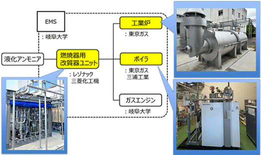 同拠点は、内閣府の戦略的イノベーション創造プログラム(SIP)第3期課題「スマートエネルギーマネジメントシステムの構築」における研究開発テーマ「アンモニア・水素利用分散型エネルギーシステム」の中核として整備した。2028年度以降の社会実装を見据え、アンモニア・水素利用分散型コージェネレーションシステム、アンモニア改質器ユニット、ゼロカーボン工業炉、ゼロカーボンボイラ、7kW可搬型発電機などの実証を進める。