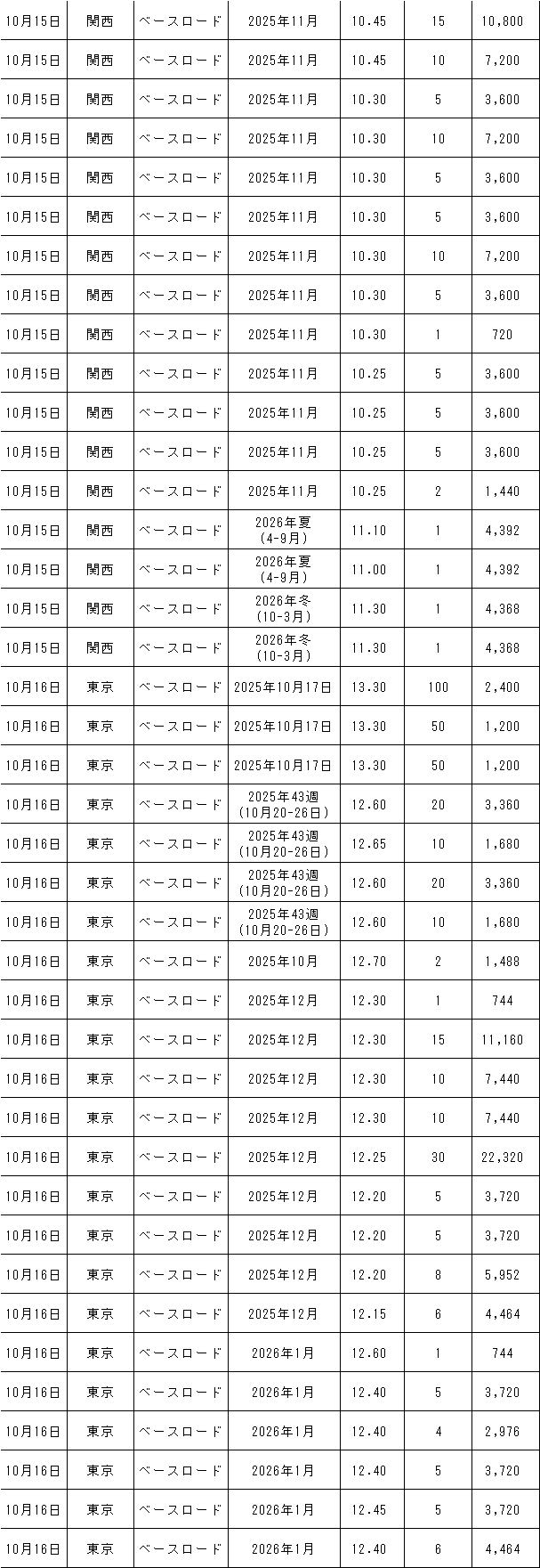 10月13~17日の東京商品取引所(TOCOM)の約定は下記表のとおり。