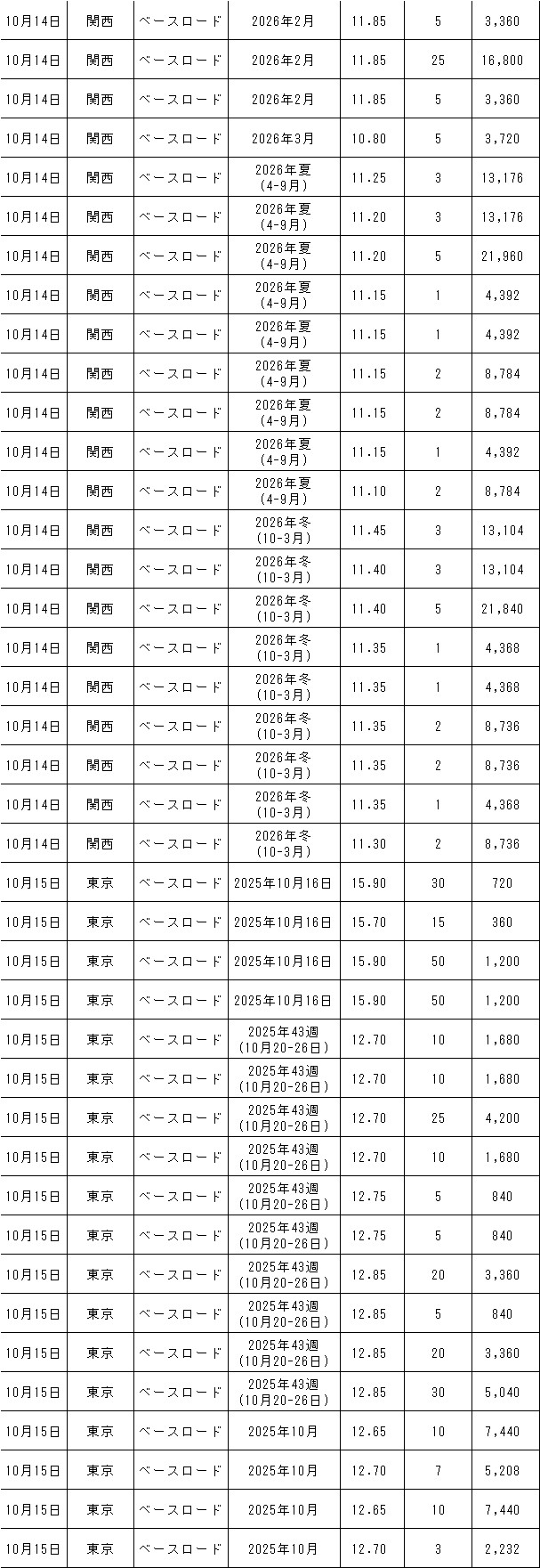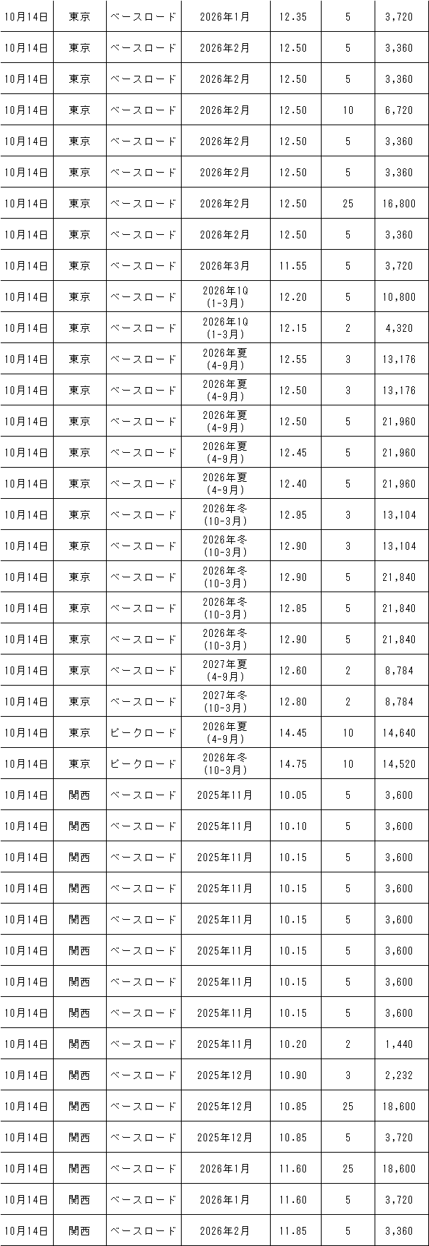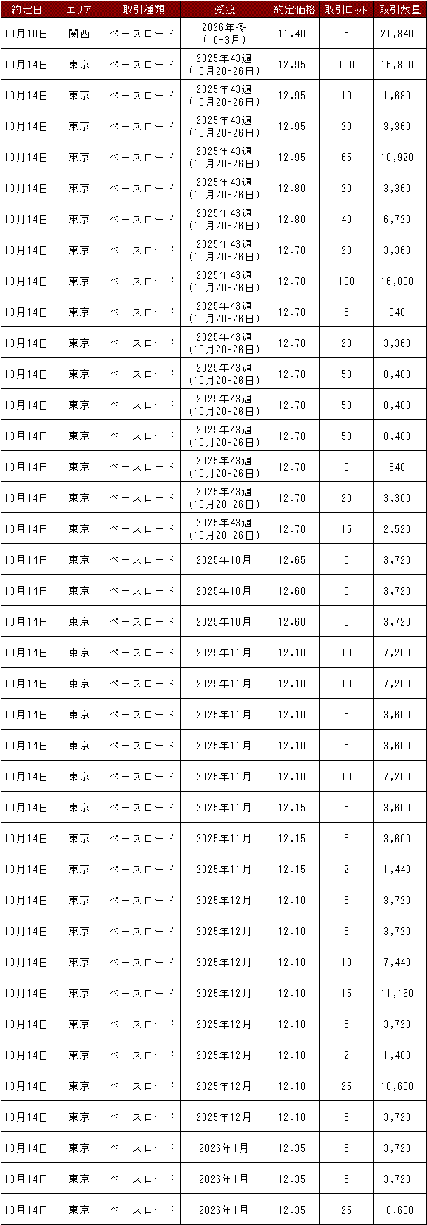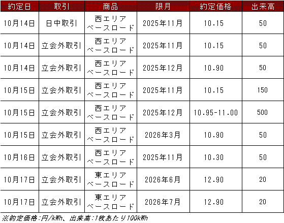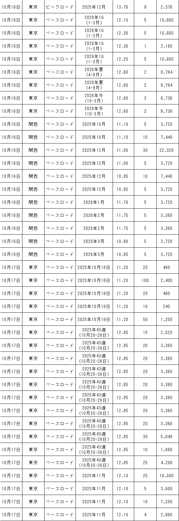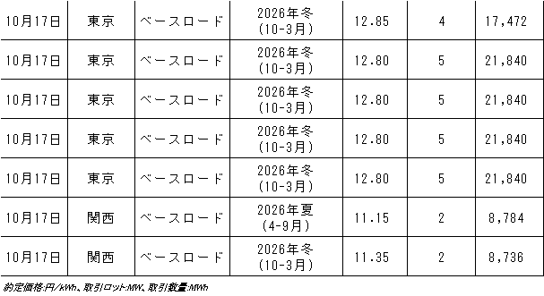 10月13~17日の欧州エネルギー取引所(EEX)の約定結果は下記表のとおり。