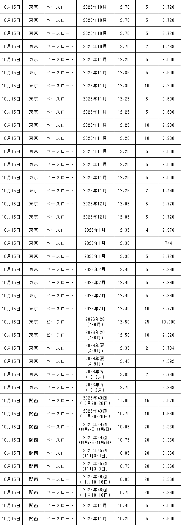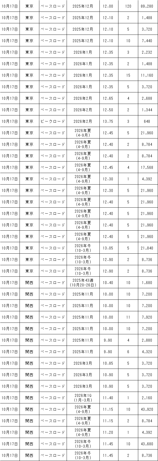 10月13~17日受け渡しの電力スポット価格24時間の週間平均は、前週から東日本(50Hz)および西日本(60Hz)ともに続伸。13日は祝日だったものの、同日を含めた週間平均は前週を上回った。西日本では、前週に続き30度前後と真夏の陽気が続いたほか、全国的に曇天の日が多かったため、太陽光発電が限定的だったことも強材料となった。 週を通じた売買入札動向は、祝日だった13日と晴れ間が広がった17日を除き、1億kWh以上の買い超となり、16日にはベース価格が北海道で20.22円、東北と東京で16.42円、中部で16.32円、北陸、関西、中国で18.56円、四国で9.77円、九州で18.65円と、四国を除き割高感の強い価格水準となった。なお、10月の月間平均は17日までの時点で東京が12.86円、関西が12.00円と、足元の先物価格を上回っている。 日本卸電力取引所(JEPX)は17日、2025年度(2026年度受け渡し)の第2回目となるベースロード取引を実施した。1年物については、東京が13.00円で20MW、関西が11.65円で17.4MW、九州が11.05円で0.6MWだった。前回の第1回目に比べて、価格は東京が0.30円安、関西が0.10円安、九州が0.05円高。約定量は、前回から東京が10MW増えた一方、関西が21.2MW減、九州が4MW減だった。なお、2年物は今回も約定がなかった。 東西の主要エリアである東京と関西の電力スポットの24時間平均の値差を見ると、13日が1.37円、14日が0.66円、15日が0.80円、17日が0.46円の東高西低で、16日が2.14円の西高東低となった。
