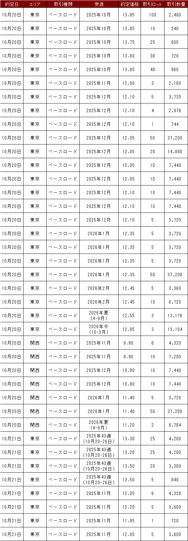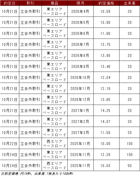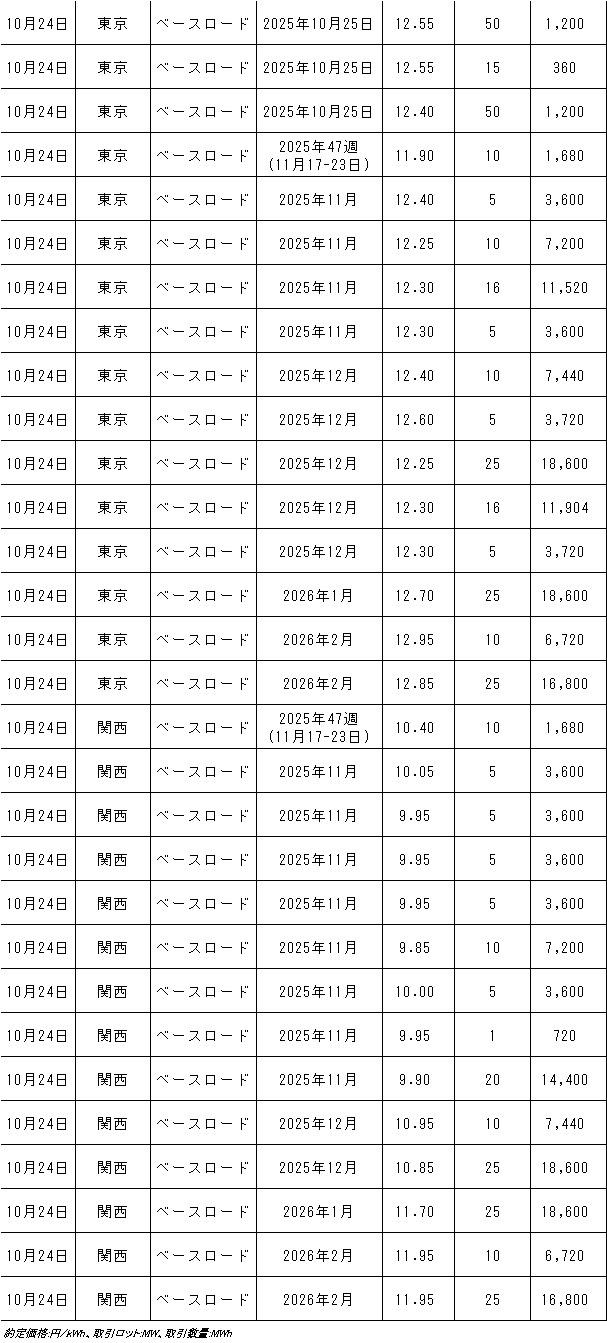 10月20~24日の欧州エネルギー取引所(EEX)の約定結果は下記表のとおり。