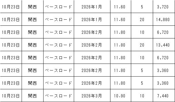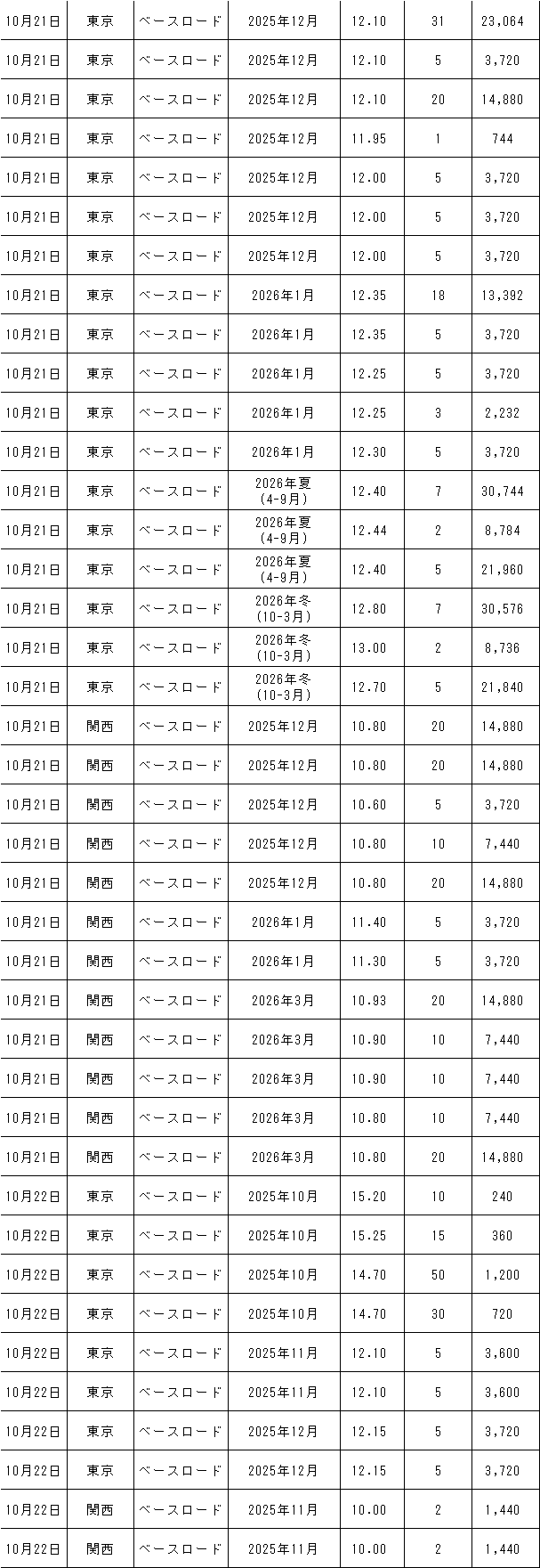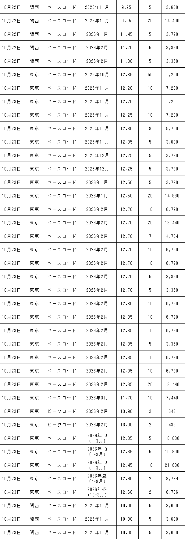 10月20~24日の東京商品取引所(TOCOM)の約定は下記表のとおり。