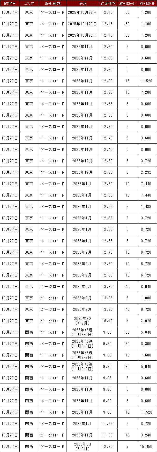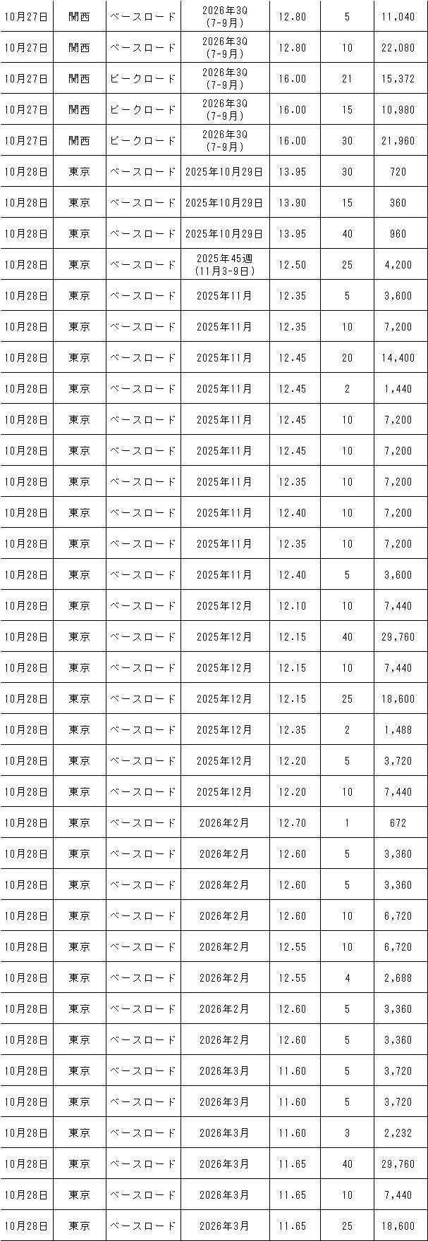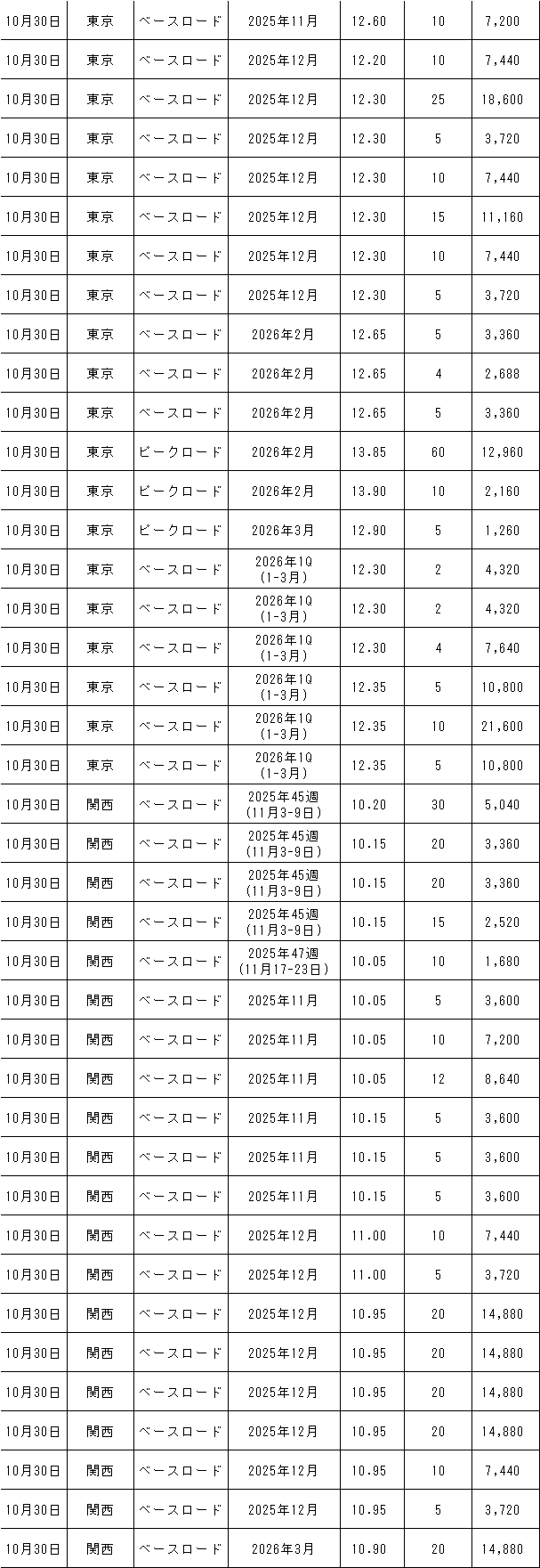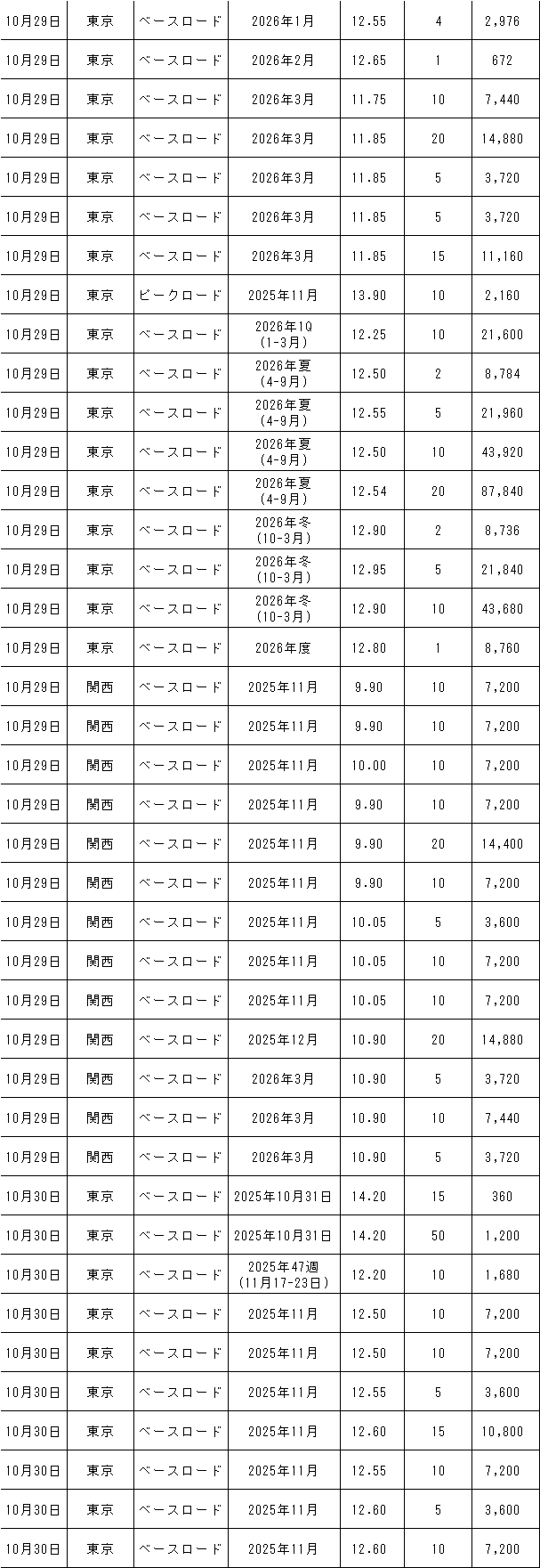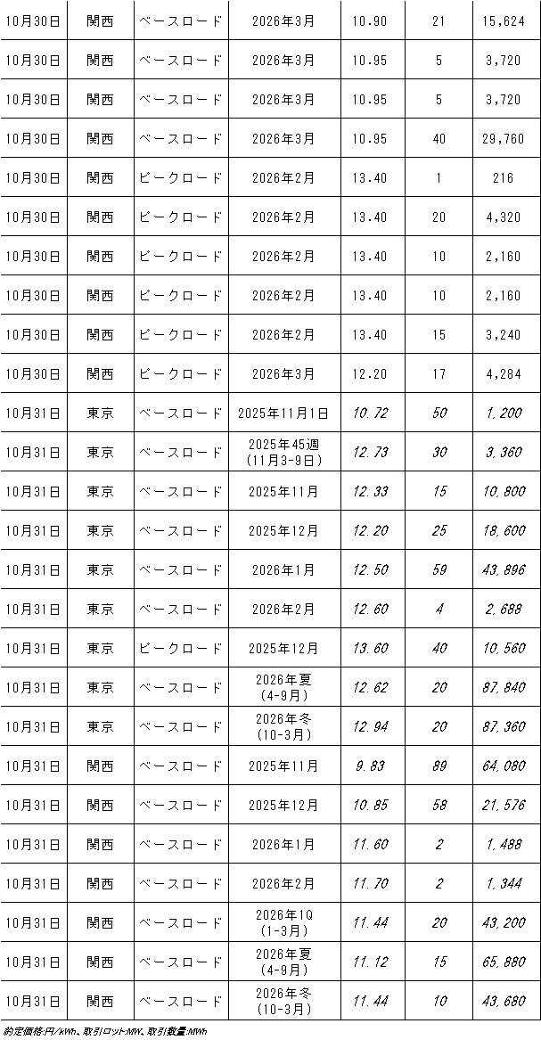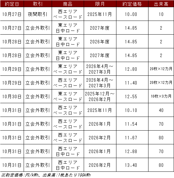10月27~31日の欧州エネルギー取引所(EEX)の約定結果は下記表のとおり。 ※11月3日7時時点で10月31日の約定の詳細な内訳は不明。10月31日の価格は帳入値。