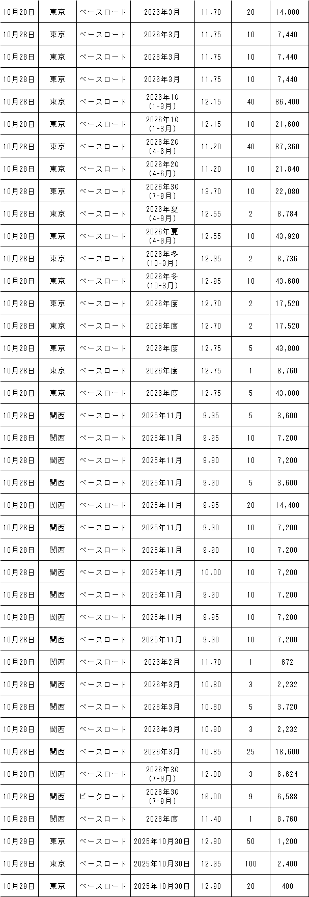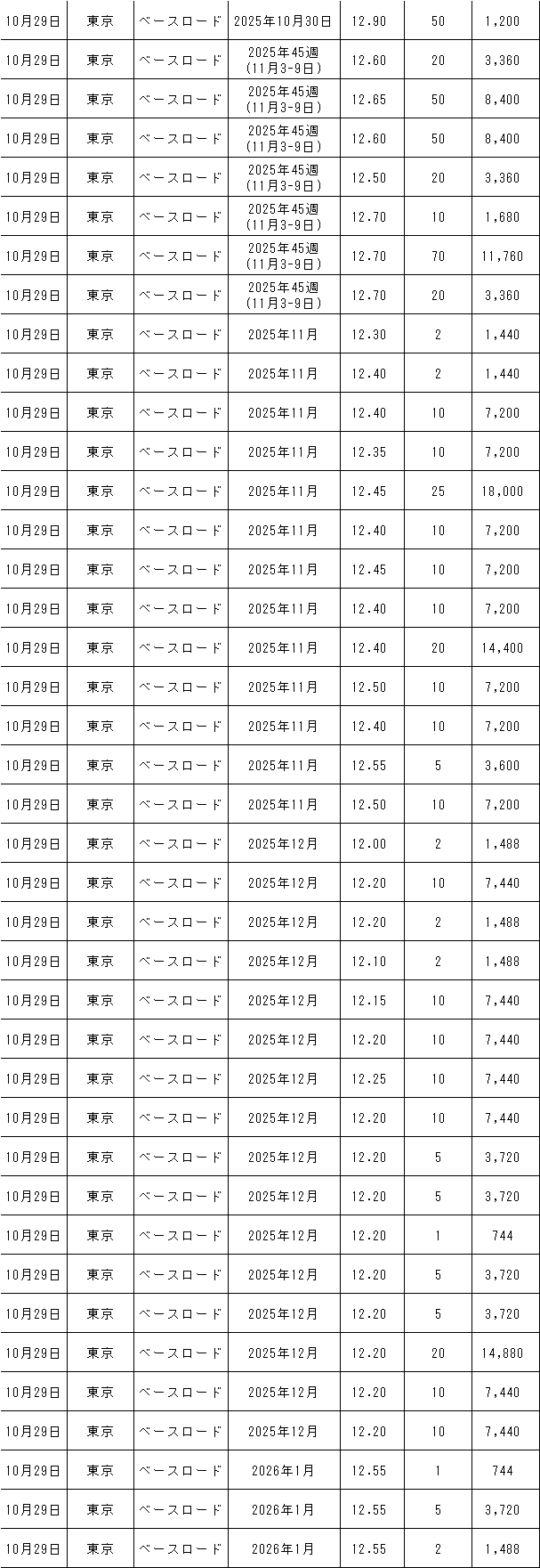 10月27~31日の東京商品取引所(TOCOM)の約定は下記表のとおり。
