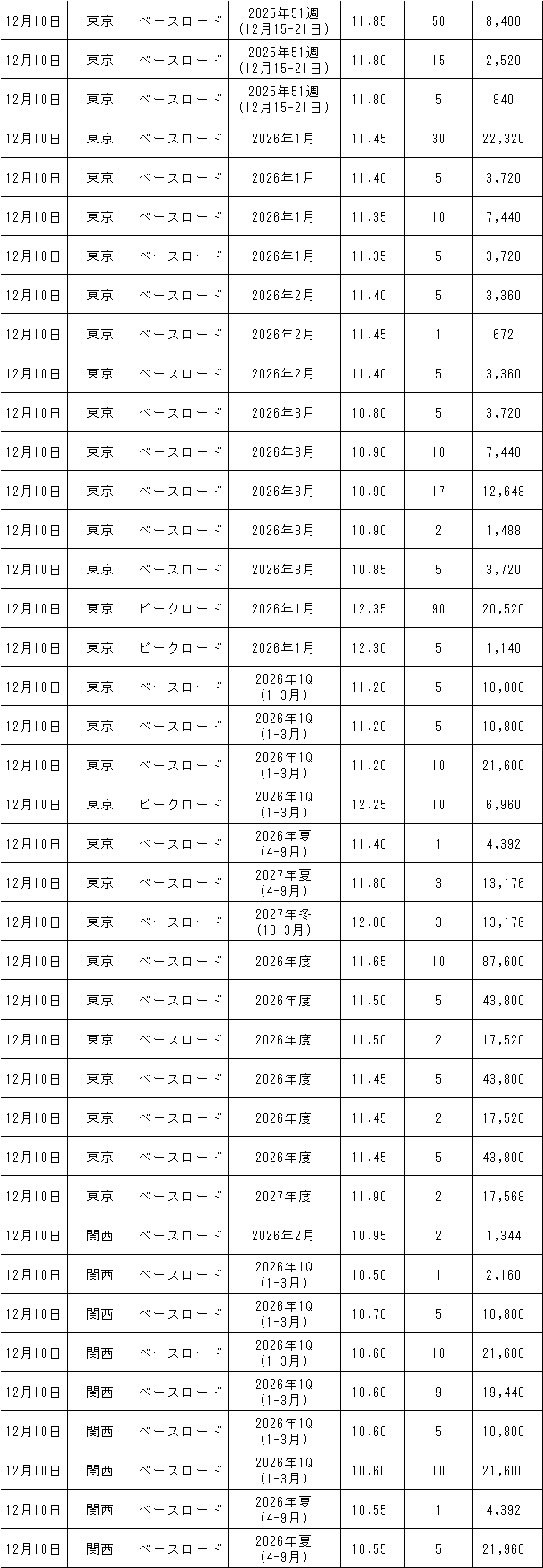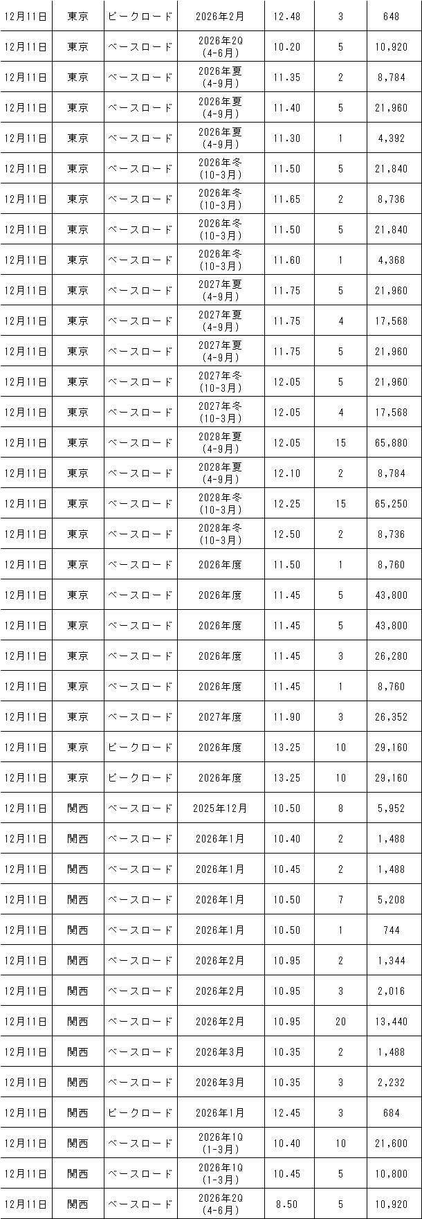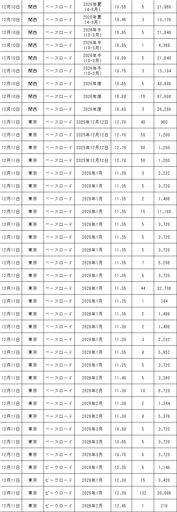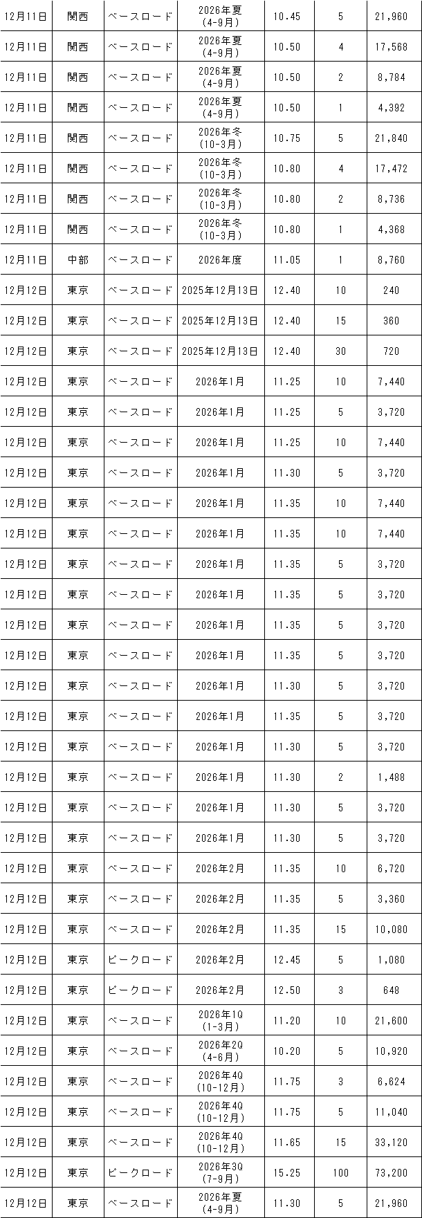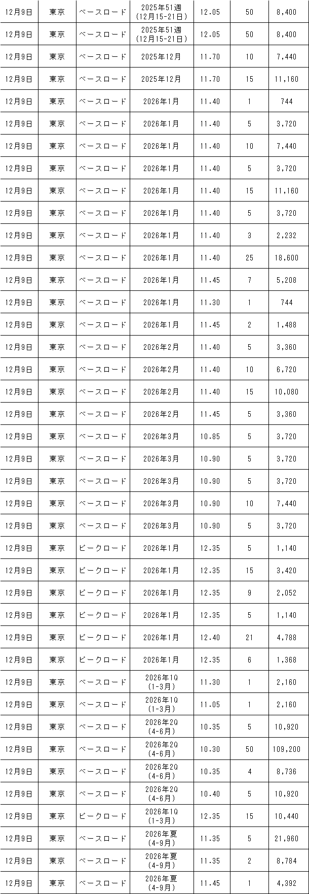 12月8~12日受け渡しの電力スポット価格24時間の週間平均は、前週から東日本(50Hz)が横ばい、西日本(60Hz)が反落した。季節相応の寒さとなった日が多かったが、潤沢な売りに支えられ、相場は小動きだった。一方、厳しい寒さが続く北海道は、8日深夜に発生した青森県東方沖地震の影響により、北海道と本州を結ぶ北本連系線の運用が停止したため、エリア内の需給引き締まりが顕著となった。このため、10日受け渡し以降の北海道の価格は一段高となり、とくに11日受け渡しでは高値で50.00円を付けるなど同日の平均価格は20円台に達した。12日午前の時点で、北本連系線は3本のうち1本のみの運用が続いている。 東西の主要エリアである東京と関西の電力スポットの24時間平均の値差を見ると、8日が0.78円、10日が0.16円、11日が0.62円、12日が0.22円の東高西低で、9日が0.30円の西高東低となった。