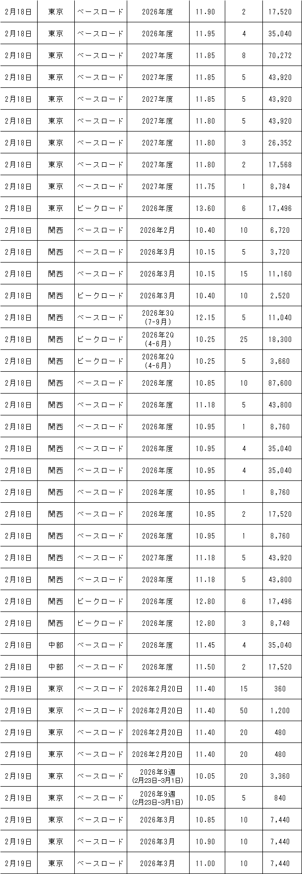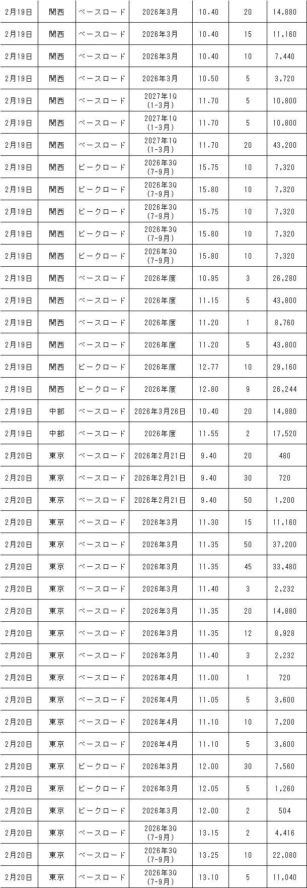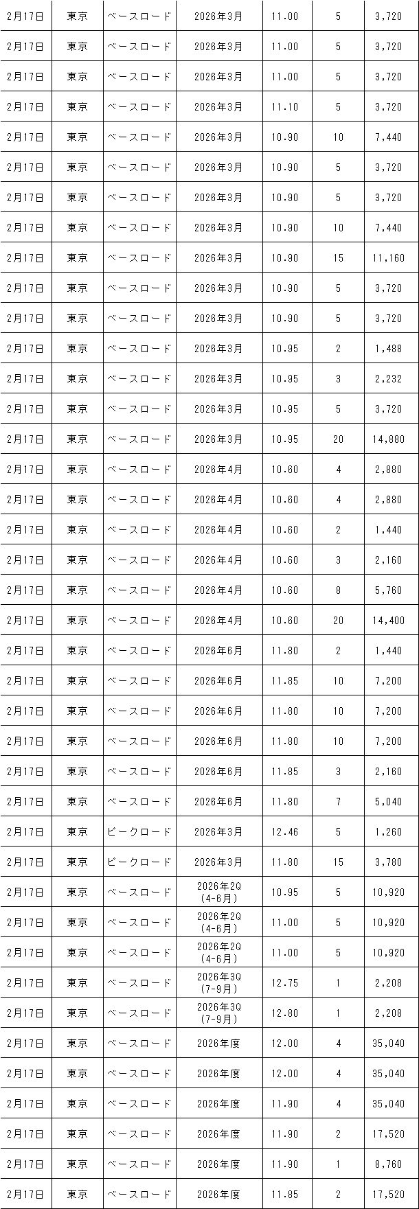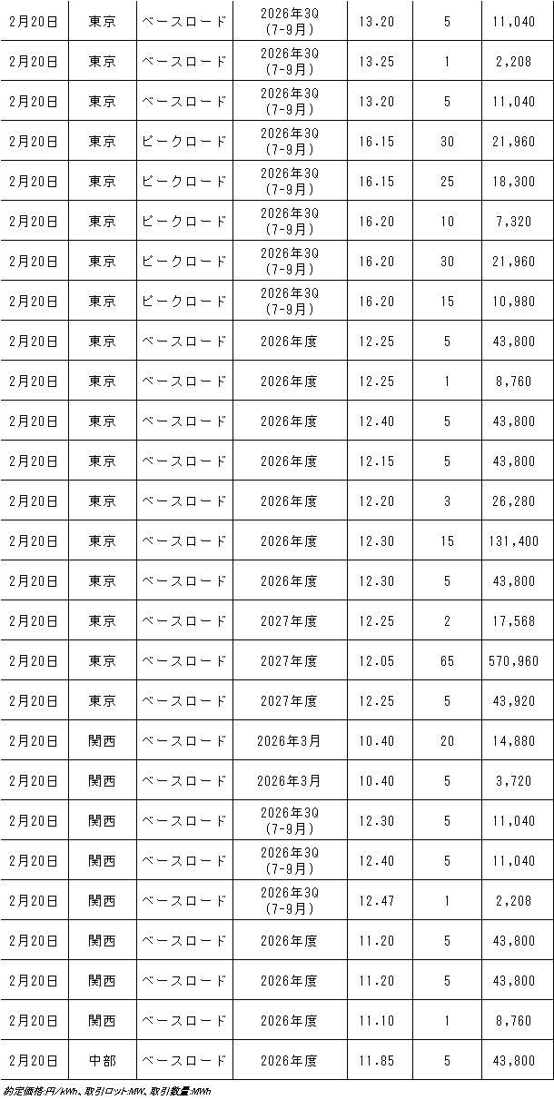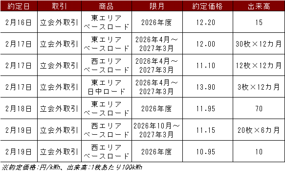2月16~20日の欧州エネルギー取引所(EEX)の約定結果は下記表のとおり。